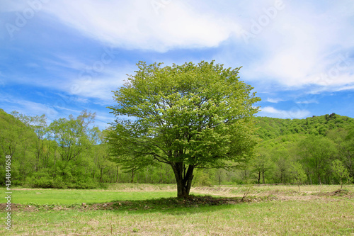 © tk2001, Fototapeta premium 畑の中に咲く一本桜・若葉(福島県・裏磐梯)