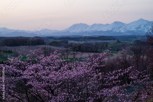 Obraz premium 春の上富良野町 深山峠の桜と十勝岳連峰