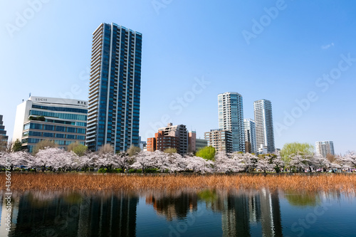 Fototapeta premium 東京都台東区 春の上野公園 不忍池の桜とビル群