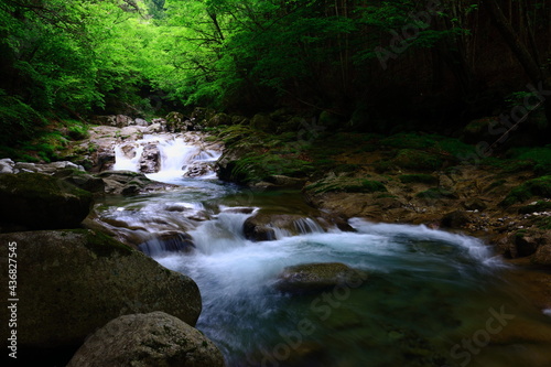 Obraz premium 岐阜県中津川市阿木川の新緑の中の清流