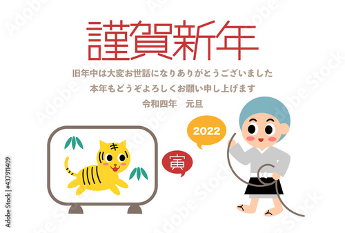 © osame, Obraz premium 2022年寅年の年賀状イラスト: 一休さんと屏風の虎