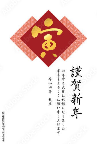 Obraz premium 麻の葉模様と筆文字「寅」の2022年(令和4年)年賀状テンプレート【赤】