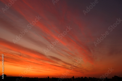 Fototapeta premium 神戸市東灘区の高層マンションからの日の出、東の空がオレンジ色に染まり、神戸・芦屋・西宮の街並みがシルエットで浮かぶ。一日の始まり。