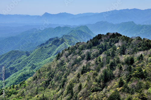 © Green Cap 55, Fototapeta premium 奥秩父の両神山山頂より望む 奥武蔵と新緑の奥秩父の眺望 奥秩父 両神山より奥左から武甲山、大持山、有間山、七跳山、西谷山、手前中央が辺見岳(二子山)