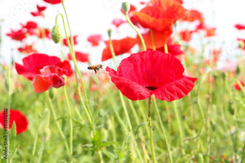 Obraz premium ポピー 赤い花 花畑 美しい 綺麗 春 鮮やか 蜂 虫 草花 春の風景 落ち着いた
