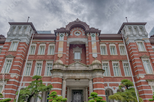 Obraz premium 東京都千代田区丸の内の東京駅周辺の雨の日の都市景観
