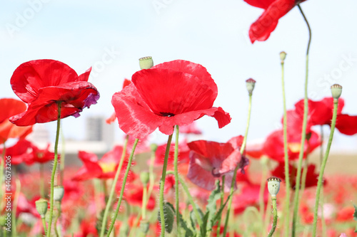 Obraz premium ポピー 赤い花 群生 花畑 ガーデン 春 グリーン 蕾 自然 レッド 美しい 可憐 綺麗 さわやか 満開