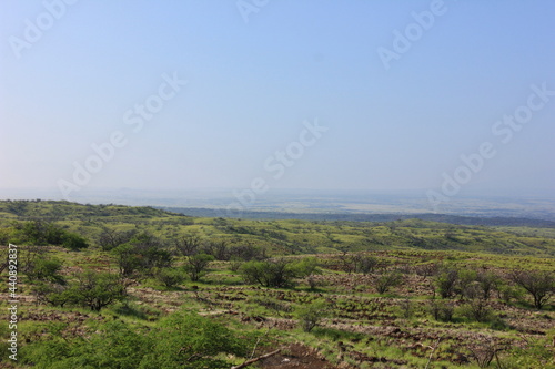 Fototapeta premium タイトル : ハワイ島(ビッグアイランド)。緑に覆われた溶岩の大地。青い空と白い空。まぶしい太陽の光が降り注ぐ。