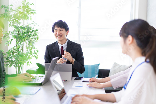 © maroke, Obraz premium 明るいオフィスでミーティングをするビジネスパーソン