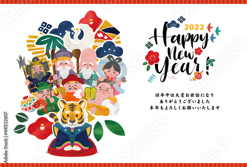 Fototapeta premium 七福神と寅のカラフル可愛い年賀状 イラストベクター素材