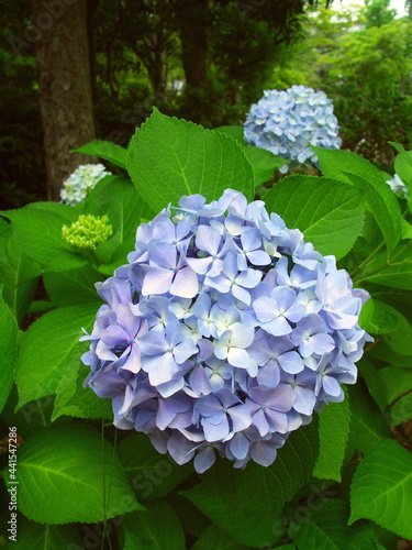 Obraz premium 梅雨の公園の日陰に咲く青い紫陽花