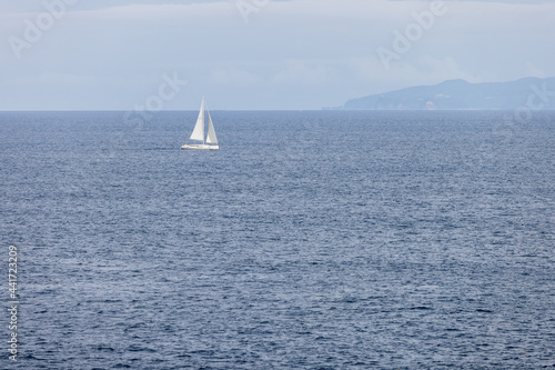 Fototapeta premium 伊豆半島沖の穏やかな海を帆走する白いヨットと伊豆大島