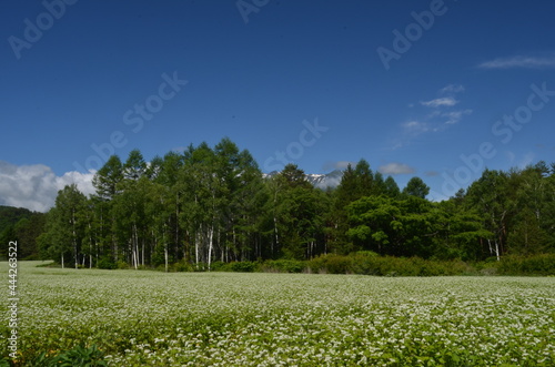 Obraz premium 開田高原青い空と白い雲とそばの花