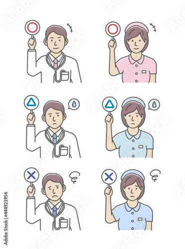 © barks, Naklejka premium ○×プレートを手に持つ若い男性医師・看護婦・ナースのイラストセット(上半身)