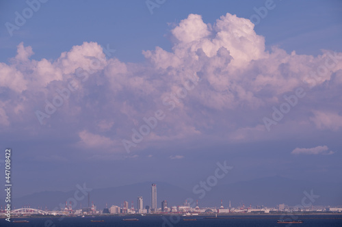 © 宮岸孝守, Fototapeta premium 夏の夕暮れ、大阪湾に入道雲が浮かぶ。夕陽がさして雲が少しオレンジ色に染まる。海の向こう岸、遠くには大阪の南港と高層ビル群が見える。神戸からの対岸の眺め。