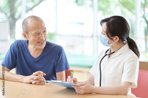 © mapo, Obraz premium 介護施設で高齢者の体調管理をする看護師