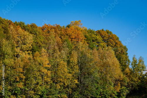 © kinpouge, Naklejka premium 色づき始めた秋の林と青空