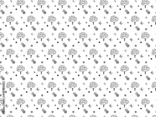 © momomi12, Obraz premium 可愛くデフォルメされた木と鳥のシンプルなパターン背景