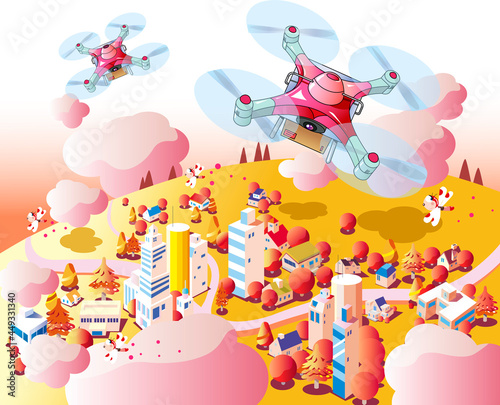 © kawano, Obraz premium ドローンと赤トンボが飛び交う秋の街並み