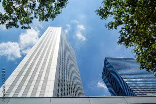 Obraz premium 夏の超高層ビル! 超高層ビルの公開空地。そこにある緑。