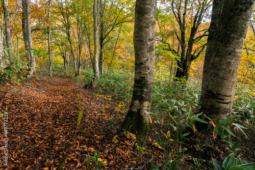 © tetsusan, Fototapeta premium 木の葉が色づく秋晴れの森