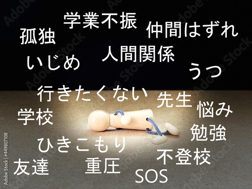 Fototapeta premium 暗闇に横向きに倒れた人形とまわりに不登校関連文字