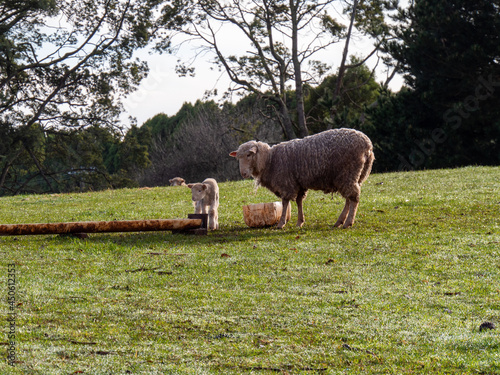 © JumsiCat, Obraz premium 子羊と親羊 牧場にて