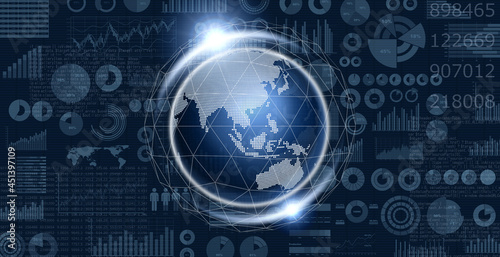 © yoshitaka, Obraz premium 円グラフや棒グラフの様々なビジネス資料とデジタルで表現した地球