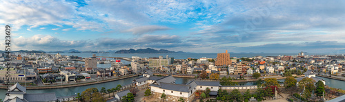 Obraz premium 今治城から望む今治市街と来島海峡の風景
