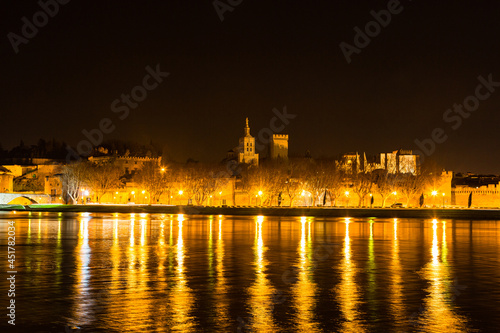 © pespiero, Fototapeta premium フランス 夜のアヴィニョン旧市街の城壁とノートルダム・デ・ドン大聖堂
