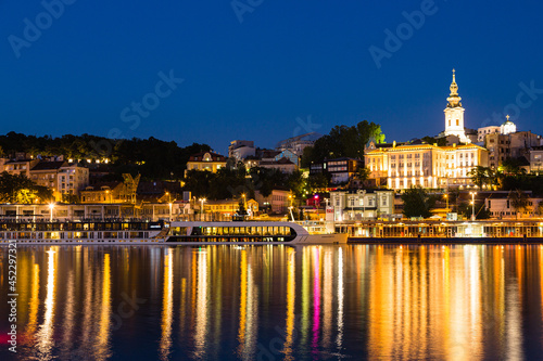 © pespiero, Fototapeta premium セルビア ベオグラードのライトアップされた聖天使首ミハイル大聖堂とサバ川沿いの夜景