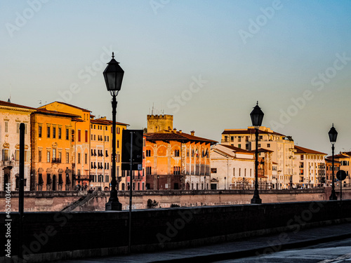 Naklejka premium 夕暮れのピサのアルノ川沿いの景色