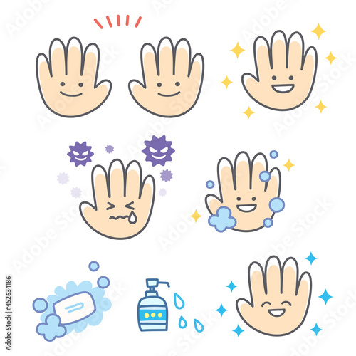 Obraz premium 手洗いや消毒に関する手の表情セット