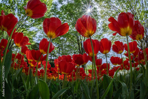 Obraz premium 赤いチューリップを見上げて