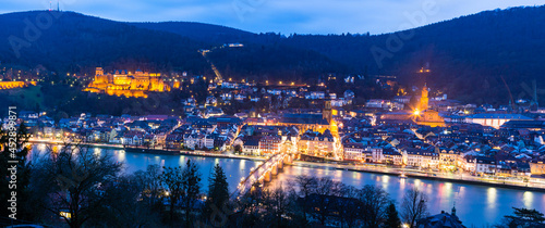 © pespiero, Fototapeta premium ドイツ ハイデルベルグの哲学者の道から望む旧市街の夜景とネッカー川