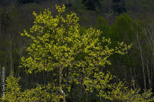 © Hiro29, Fototapeta premium バケカンバの枝先の若葉が透過光に照らされてキラキラ光っている