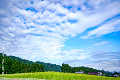 © ZUN, Obraz premium 雲が多い青空に収穫前の稲が広がる田園風景