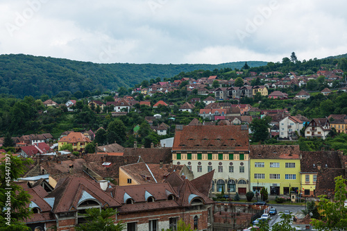 © pespiero, Obraz premium ルーマニア トランシルヴァニア地方のシギショアラの歴史地区から見える丘の上の街並み