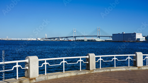 Obraz premium 横浜の山下公園 海際の白い手摺から横浜港を一望(神奈川県横浜市)