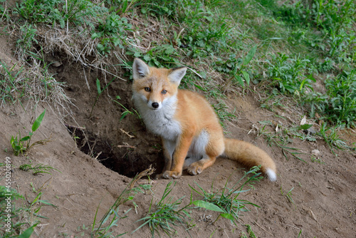 Obraz premium 巣穴の前に座るキタキツネの子ども(北海道・知床)