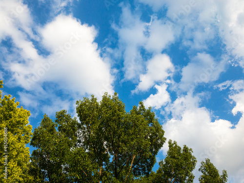 Obraz premium 初夏の青空と白い雲と新緑の樹木