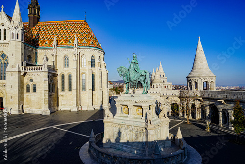 Obraz premium 小塔のある要塞跡広場の騎馬像とマーチャシュ聖堂