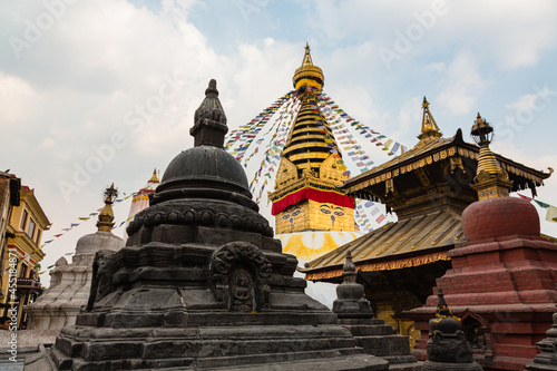 © pespiero, Fototapeta premium ネパール カトマンズのモンキー・テンプルとも言われるスワヤンブナート寺院のブッダアイが描かれているストゥーパ