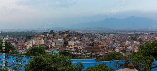 Naklejka premium ネパール カトマンズのスワヤンブナート寺院のある丘から見える市街地の街並み