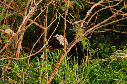 Obraz premium タルコレス川流域の林の中で枝に止まって様子をうかがうシラガゴイ