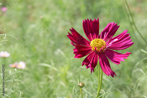 Obraz premium 秋桜 コスモス 鮮やか はなびら 赤紫 ワインレッド 花畑 美しい グリーン かわいい 草