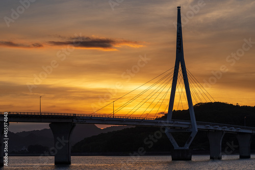 Obraz premium 朝焼けと周防灘にかかる周防大橋