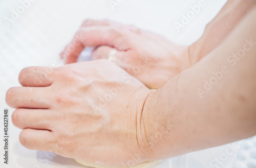 © Masaharu Shirosuna, Fototapeta premium 生地をこねる人の写真。パン・ピザ作りのイメージ。
