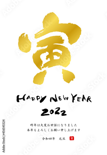 Obraz premium 寅年 年賀状 筆文字 テンプレート 2022年 金文字