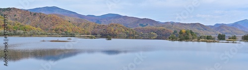 Obraz premium ちょうど見頃の紅葉の秋元湖のパノラマ情景@福島